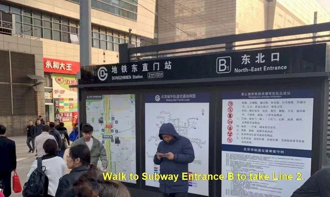 From here, you walk long Dongzhimenwaixie Street (东直门外斜街)for about 420 meters. Then you walk on Dongzhimen Outer Street ( 东直门外大街)for about 100 meters to reach Dongzhimen Public Transport Hub (东直门交通枢纽). Then please look for Subway Line 2 Station (Entrance B) ( 地铁二号线地铁东直门站B口 ) to take the Line to go to your hotel location or nearby.